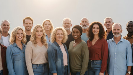 Diverse group smiling outdoors, casual denim and knitwear, soft sky