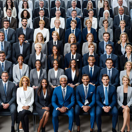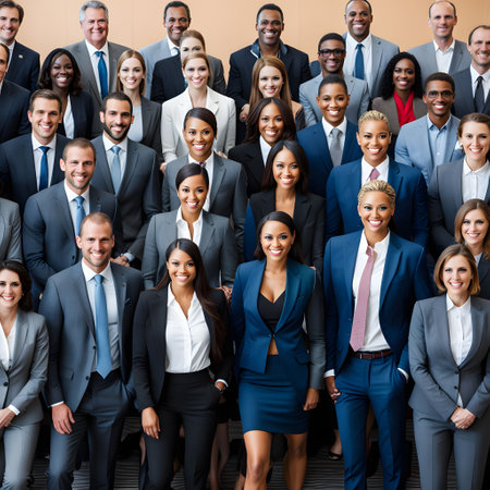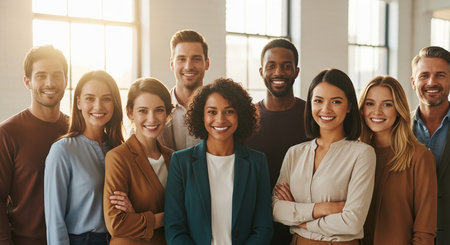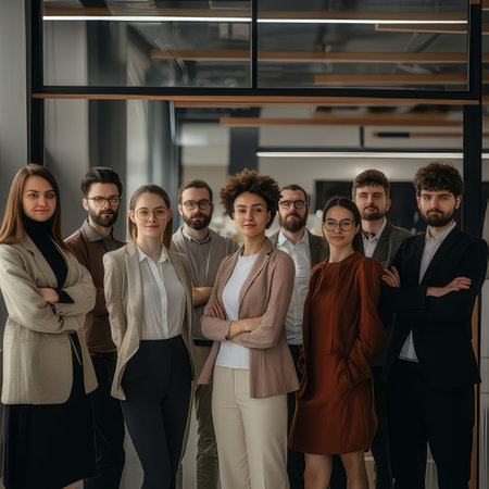 A diverse group of professionals stands confidently in an office environment, dressed in business attire. High quality photo