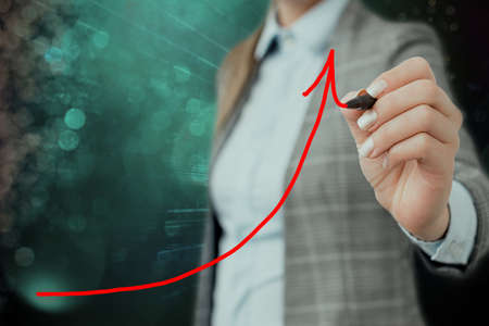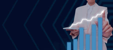 Business development to success and the concept of annual revenue growth. Businesswomen points to a corporate plan for future growth