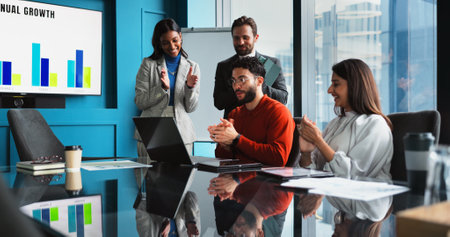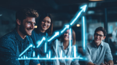 Business meeting with smiling professionals discussing growth strategies, featuring digital graph illustrating upward trends. atmosphere is collaborative and optimistic