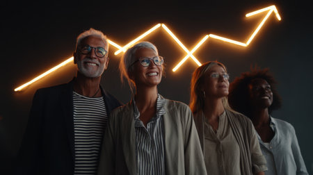 Empowered individuals stand together, smiling confidently against dark background with glowing upward trend line. Their expressions reflect optimism and success in professional setting