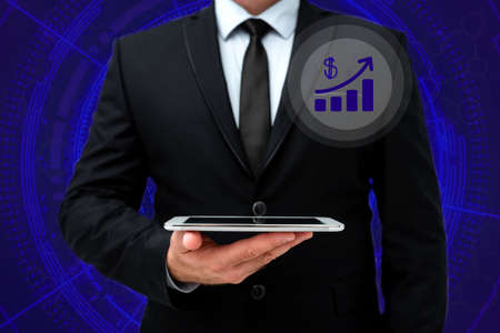 Businessman Holding Tablet With Graph And Pen Which Points On Arrow Up And Presenting Crutial Ideas. Man In Suit Having Cellphone And Pencil In Hand To Show Important News.