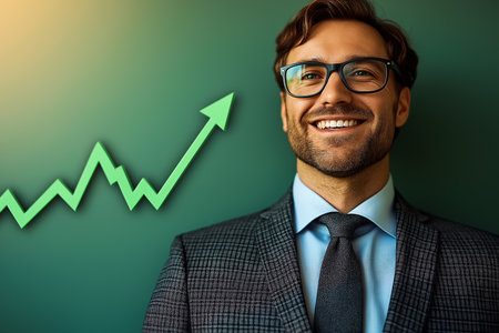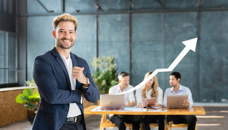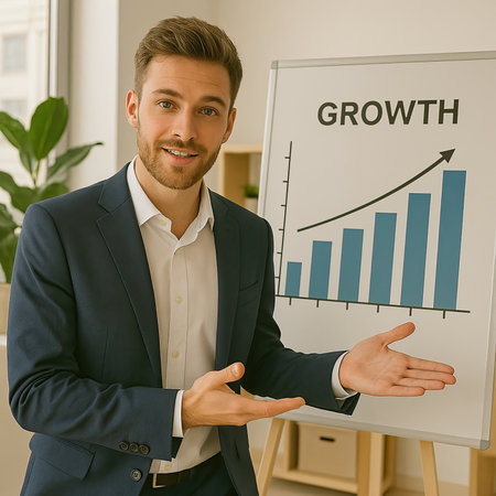 Confident businessman in suit stands by whiteboard with rising bar chart. Professional office setting illustrates business growth success and progress.