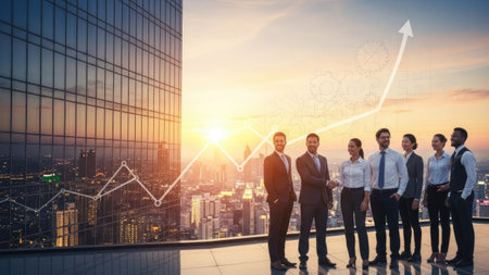 Group of business professionals showcases collaboration and success in finance with a backdrop of a growing graph signifying positive trends and achievements.