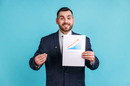 Satisfied bearded businessman wearing official style suit showing business growth graph, pointing at paper document with pen and pencil. Indoor studio shot isolated on blue background.