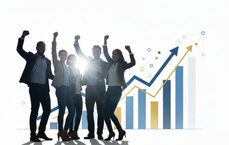 Silhouetted business team celebrates victory and achievement in front of a rising blue and yellow financial graph