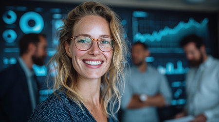 Confident Businesswoman Smiling in Modern Office with Data Charts and Colleagues in the Background, Emphasizing Team Collaboration and Analytics