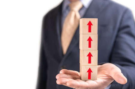Sales and economic growth concept. Financial growth graph. Sales increase, marketing strategy concept. Businessman hold wooden cubes with red arrow sign. isolated on white