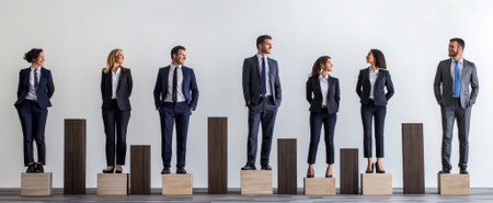 Diverse business professionals stand confidently on pedestals in a modern office. This image symbolizes teamwork, achievement, and the pursuit of success in a corporate environment.