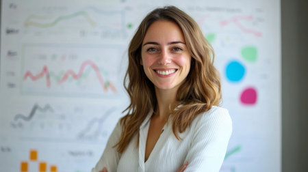 A portrait of a businesswoman smiling confidently in front of a whiteboard with business graphs and charts, showcasing her role as a leader and strategist in the workplace.