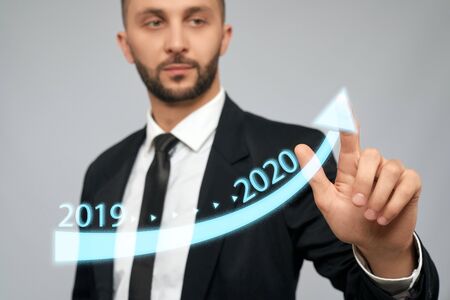 Front view of young serious businessman in black suit in office. Selective focus of digital tactile charts screen, bearded man clicking virtual arrow. Concept of digitalization, high technilogies.