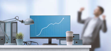 Financial chart on computer screen showing growth and positive trend, businessman celebrating in the background