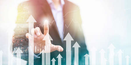 Businessman point hand on arrow graph with high rate of growth show Financial, sale profit, Business plan, Stock market investment, Economic growth concept. Business man draw report chart up forward