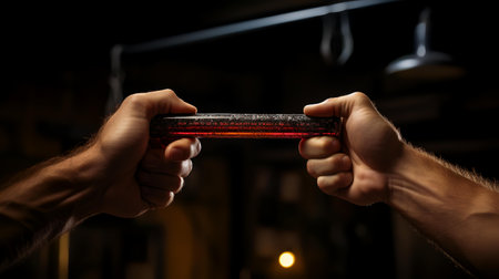 Close-up of two male hands holding a gamepad in a dark room