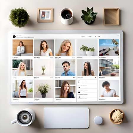 A modern desktop showcasing a computer screen displaying various social media profiles with diverse individuals and engaging content. Ideal for marketing. social media. business. and online communication concepts.
