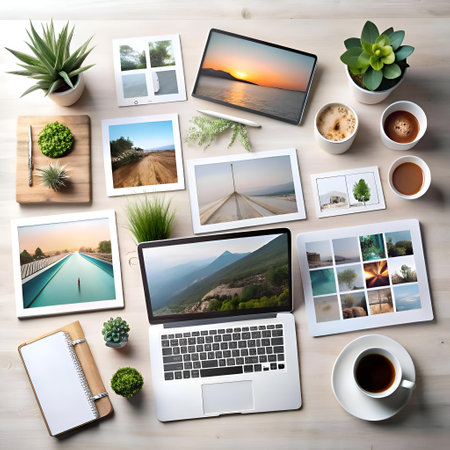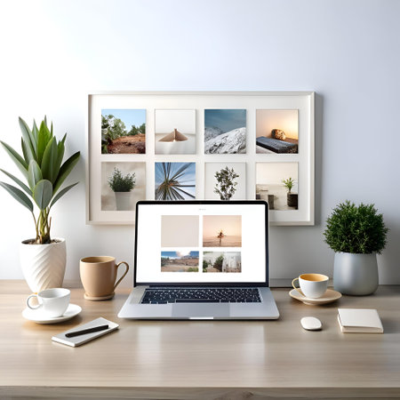 A modern workspace with a laptop open to a digital portfolio. showcasing a photographer's work. Minimalistic design with plants. mugs. and a notebook. Ideal for illustrating creativity. design. and online portfolio presentation.
