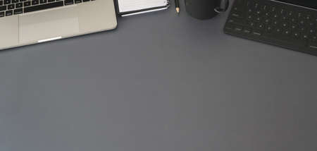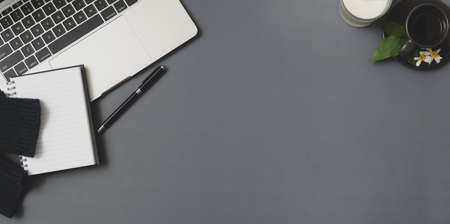 Top view of modern workplace with laptop computer and office supplies on dark grey table background