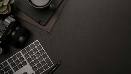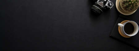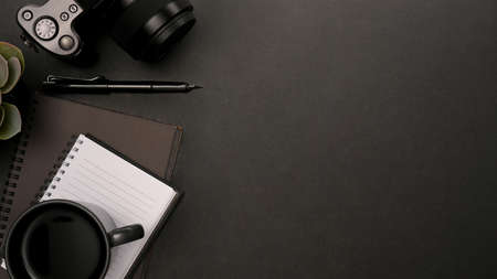 Top view of dark concept office desk with camera, decorations and copy space on black table