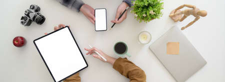 Top view of digital devices on worktable with mock up tablet, smartphone, camera and stationery