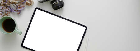 Top view of modern workspace with mock-up tablet, coffee cup, camera, coffee cup and copy space on white table
