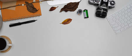 Top view of photographer comfortable workspace with office supplies on white table background with camera