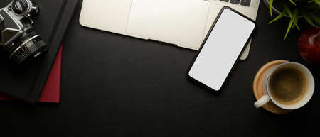 Top view of workspace with laptop, camera, supplies and copy space on black desk