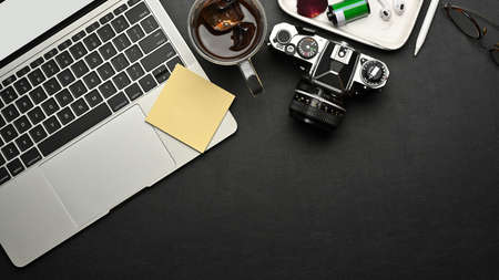 Top view of stylish photographer workspace with camera, laptop, office supplies and copy space on black table