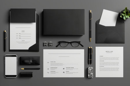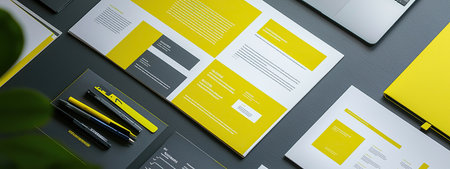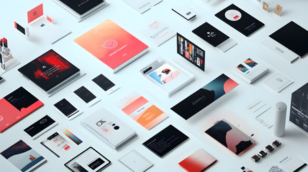 A creative flat lay showcasing modern graphic designs and branding materials on a clean surface.
