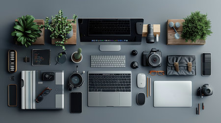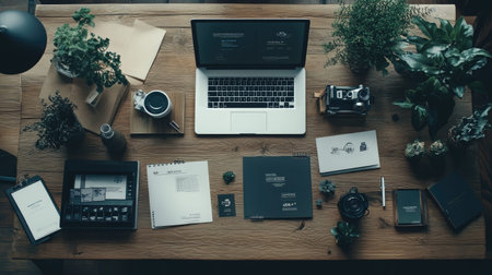 This image showcases an organized workspace with a laptop, camera, notebooks, coffee, and plants, perfect for creative professionals looking for inspiration and a productive environment.