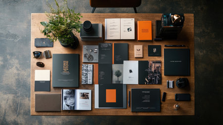A stylish workspace featuring various stationery items, photography books, and decorative plants arranged neatly on a wooden desk, ideal for business and lifestyle projects.
