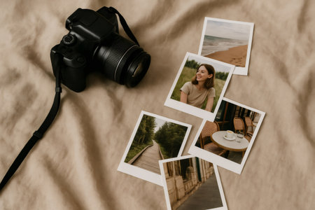 Modern digital camera is lying on beige blanket near several printed photos depicting various travel destinations
