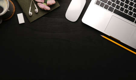 Overhead shot of dark modern workplace with laptop computer and copy space on black table with copy space