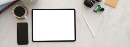 Top view of minimal photographer workplace with mock-up tablet, smartphone, camera and other supplies on marble desk