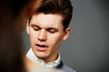 Portrait of young man screaming. Looking up in anger and making angry hand gestures.