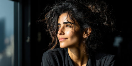 Woman with curly hair smiles while enjoying the sunlight and looking out over the city skyline in a modern space.