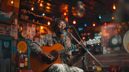 Young African American man singing passionately into a microphone while playing an acoustic guitar in a cozy, warmly lit caf