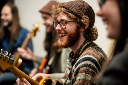 Young man wearing a beanie and glasses laughs heartily, playing an electric guitar during a band practice session with friends