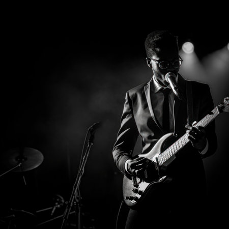 Young adult singer performs rock music on stage with spotlight generated by artificial intelligence