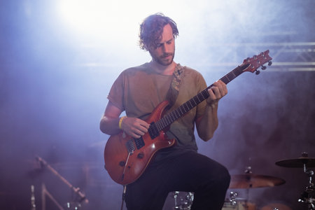 European man skillfully plays an electric guitar, radiating confidence and musical talent