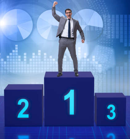 Businessman figure standing on wooden podium number 1 2 and 3 for business ranking competition concept.