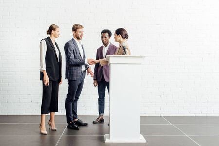 four multiethnic colleagues in formal wear talking and shaking hands in conference hall