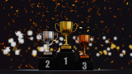 Gold champion trophy cup on winner 1, 2, 3 podium, stage for the first, second and third place, 3D rendering.