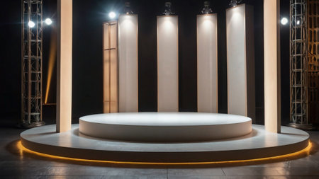 3D rendering of a podium illuminated with spotlights in an exhibition hall