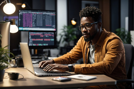 Focused african software developer is coding on his computer in a busy office environment