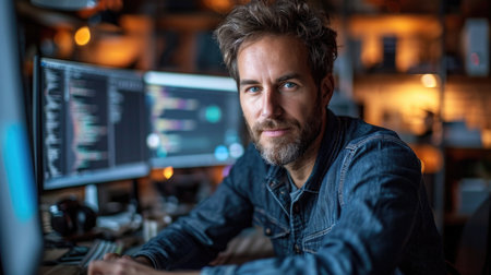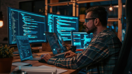 A software developer works on code late into the night, illuminated by the glow of multiple computer screens in a modern office. AIG41