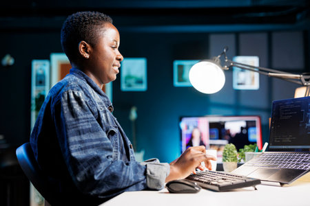 Female freelancer works at a desk, using a laptop to manage a futuristic information system. African american woman using her personal computer for cybersecurity and programming, working at home.