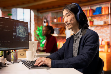AI startup office chief technology officer listening music while building application. Senior developer wearing headphones while working in artificial intelligence software development agency
