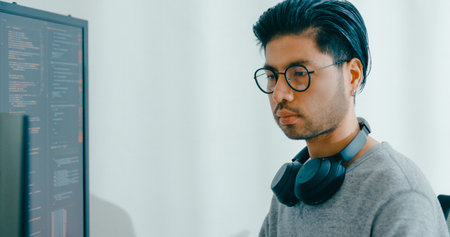The close up picture of the middle eastern male software developer is working in the office while programming the program on the monitor, a software developer require knowledge and experience. AIG43.