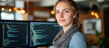 A young software developer sits at her computer, coding and debugging with multiple monitors in a modern office setting. The space features bright lighting, modern decor, and collaborative work environments.