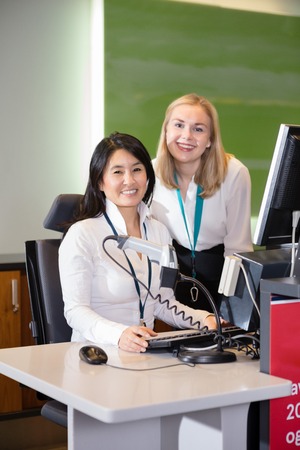 Happy security data center operator colleagues (coworkers) smiling and monitoring the CCTV footage while typing on a keyboard.